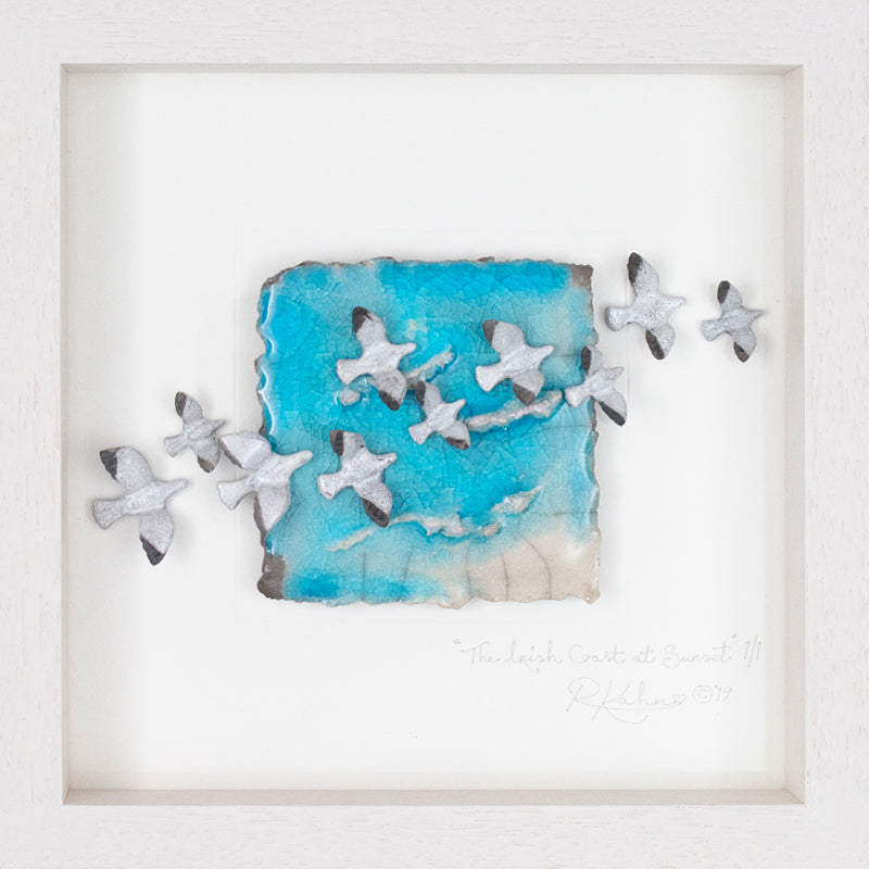 This piece portrays the stunning, rugged coastline of our beautiful Ireland! With turquoises, blues, and tiny hints green reflections as the sunset kisses the water. May remind you of your favourite beach as a child...