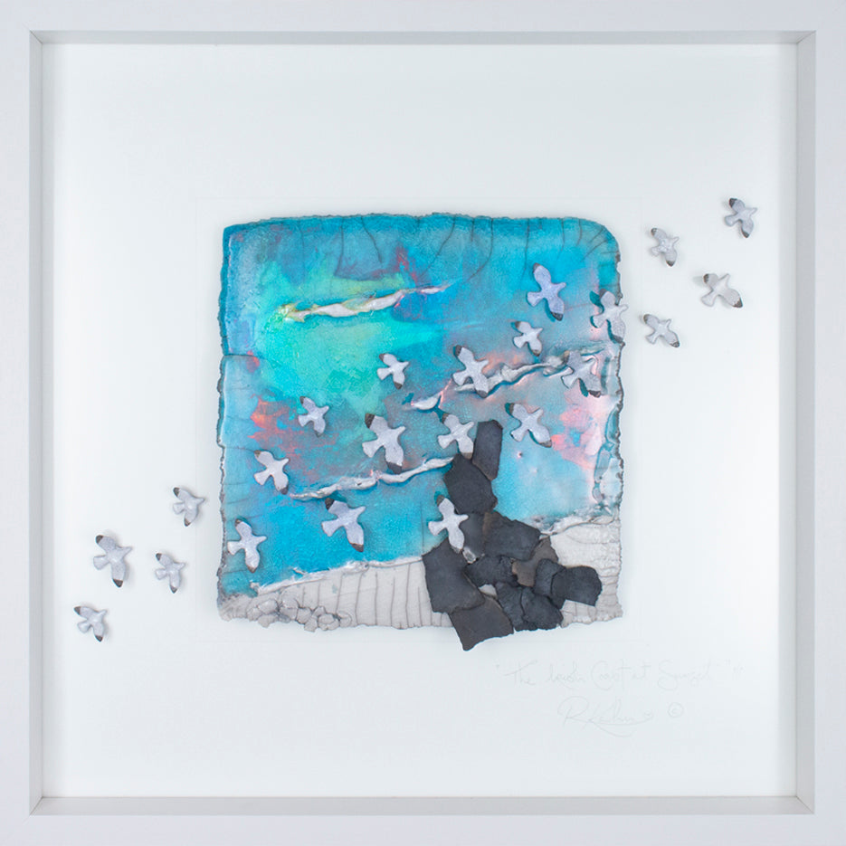 This piece portrays the stunning, rugged coastline of our beautiful Ireland! With turquoises, blues, greens and little metallic reflections as the sunset kisses the water. The colours will move and change throughout the day as the daylight changes catching lots of different little details every time you look at the piece. . ..Always reminds me of my favourite beach as a child.