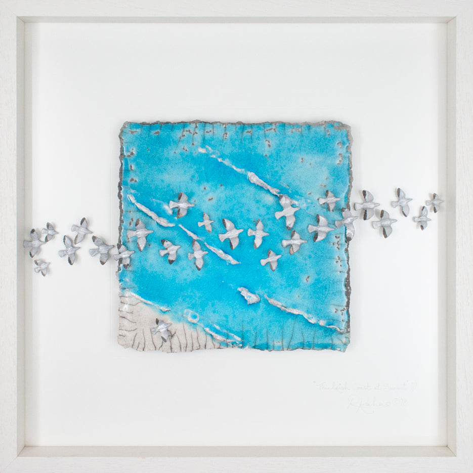 This piece portrays the stunning, rugged coastline of our beautiful Ireland! With turquoises, blues and green reflections as the sunset kisses the water. Always reminds me of my favourite beach as a child.