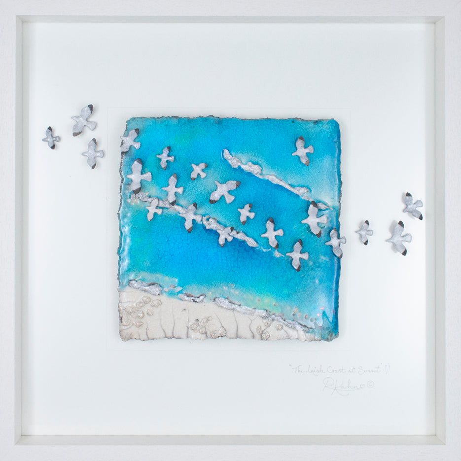 This piece portrays the stunning, rugged coastline of our beautiful Ireland! With turquoises, blues, greens and little tiny metallic reflections as the sunset kisses the water. . ..Always reminds me of my favourite beach as a child.