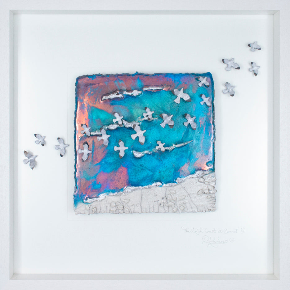 This piece portrays the stunning, rugged coastline of our beautiful Ireland! With turquoises, blues, greens and stunning metallic reflections as the sunset kisses the water. Always reminds me of my favourite beach as a child.