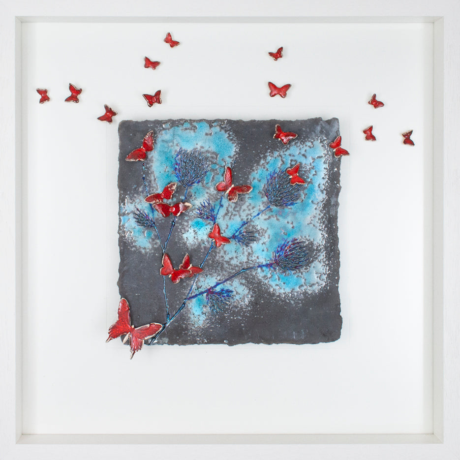 This piece has no title yet!! You get to decide what you would like it to be named! Just fill in your required title in the personalisation box or 'Special Requirements' box at the checkout and I will add this for you! (Tip: try to keep it nice and short as this tends to look best). From my "PURE Collection" this piece has the most amazing little details in a dreamy oil slick and bronze metallics, merged with so many shades of turquoise and blues contrasted with rich, vibrant red butterflies against my 'PURE' raku slate grey and soft black backgrounds!